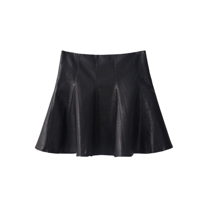 マットな質感のレザーフレアミニスカートです。
