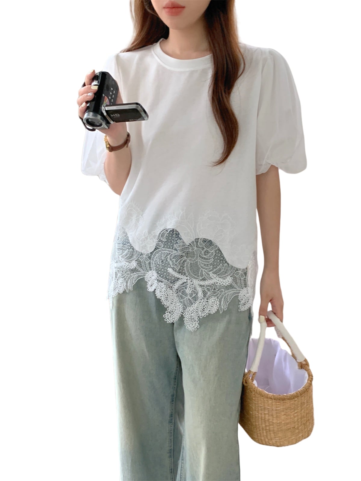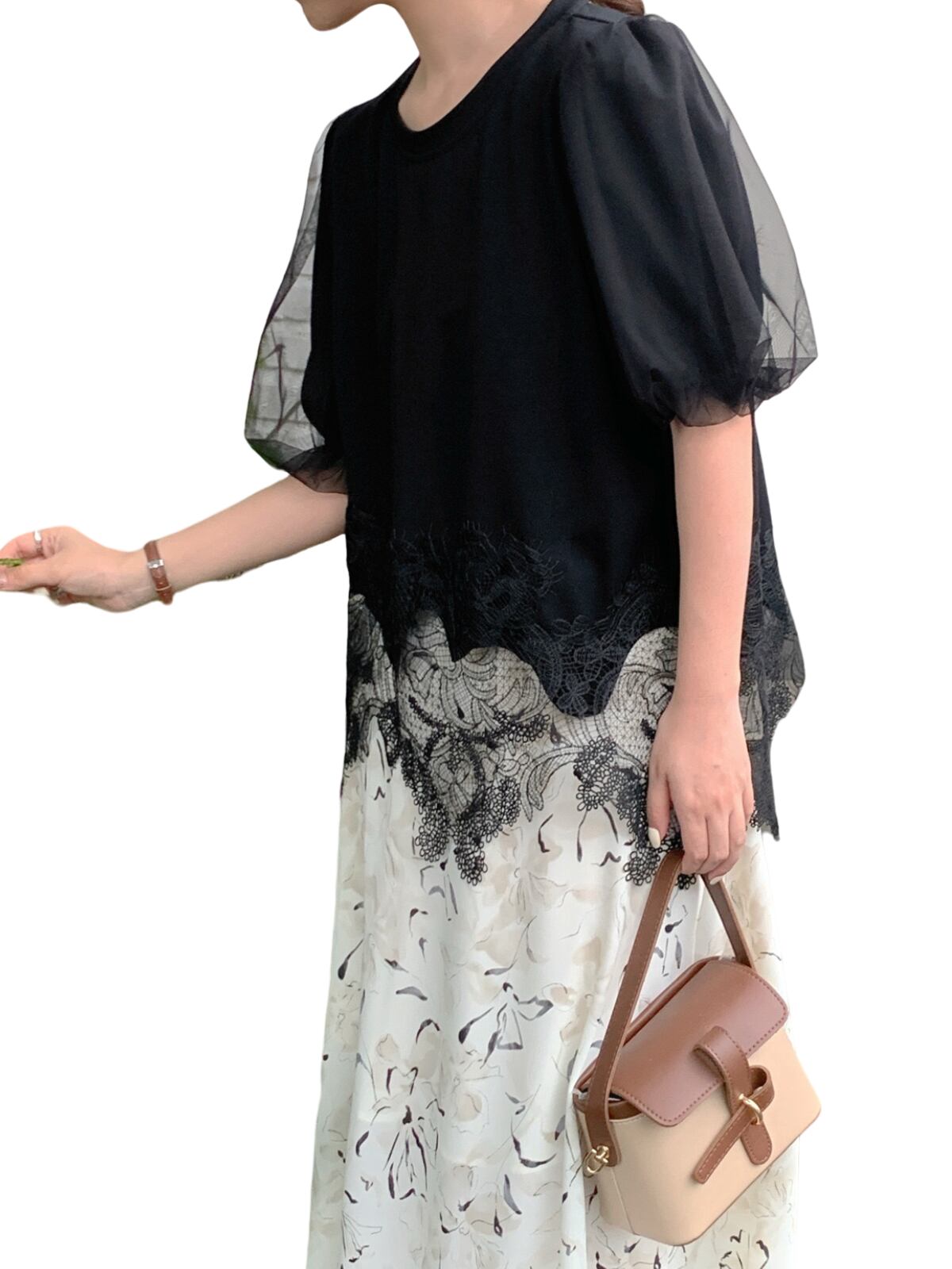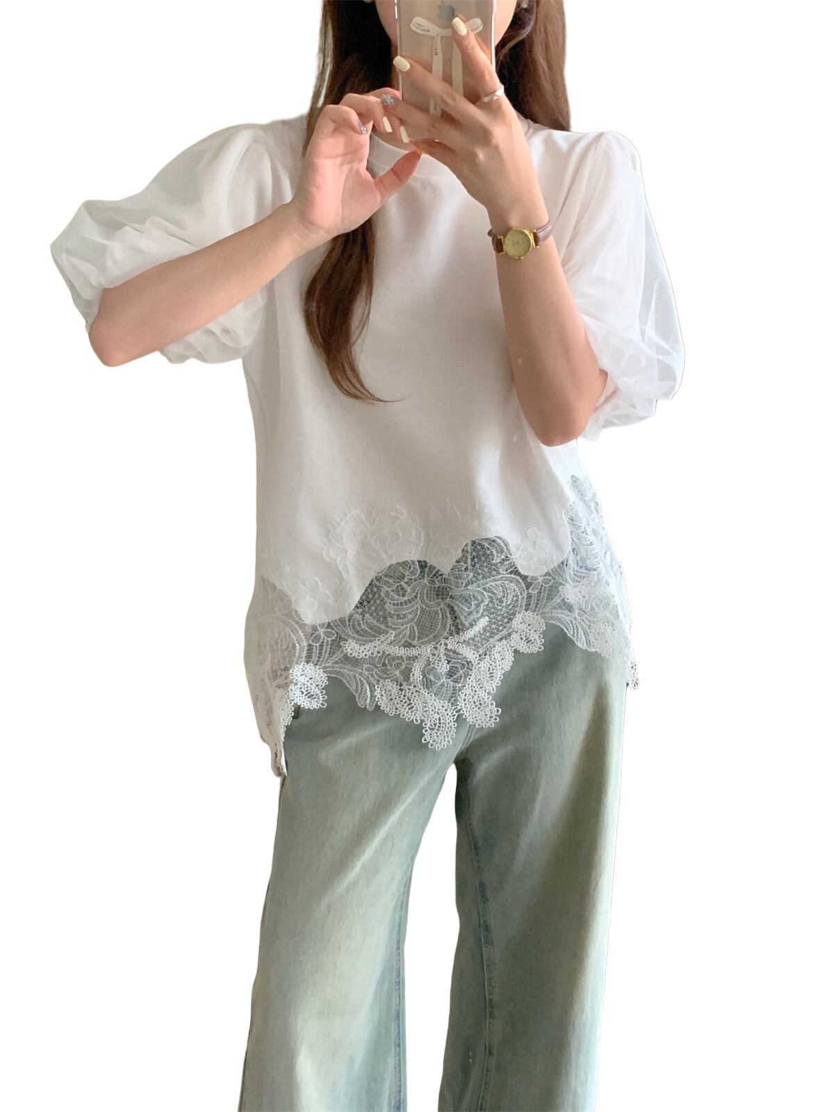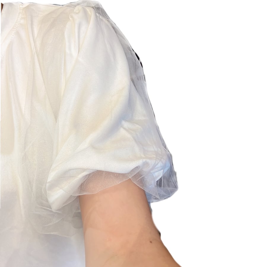 変形レースパフスリーブTシャツ