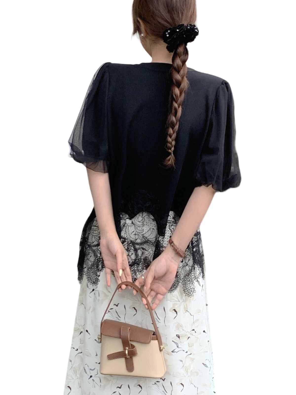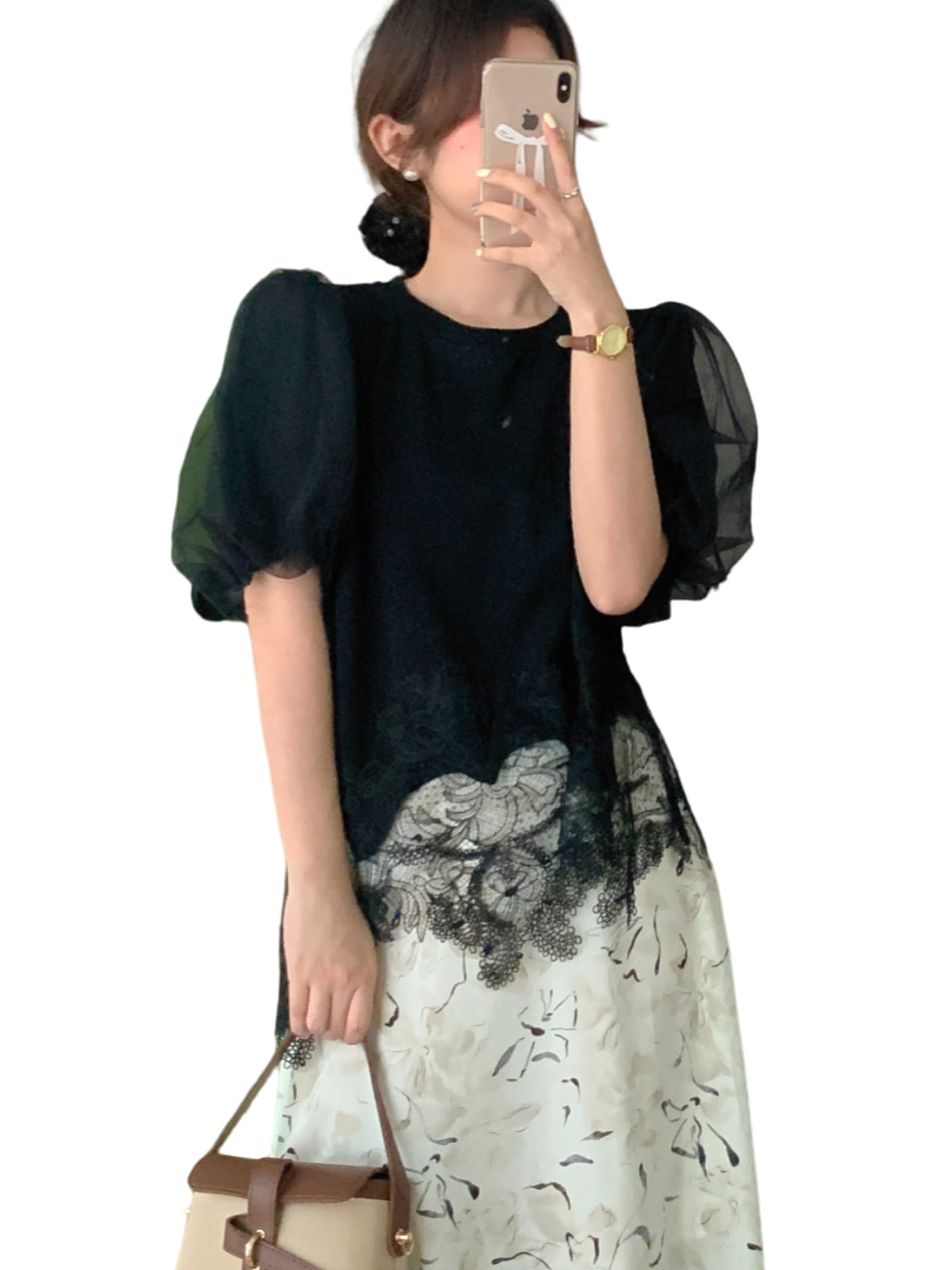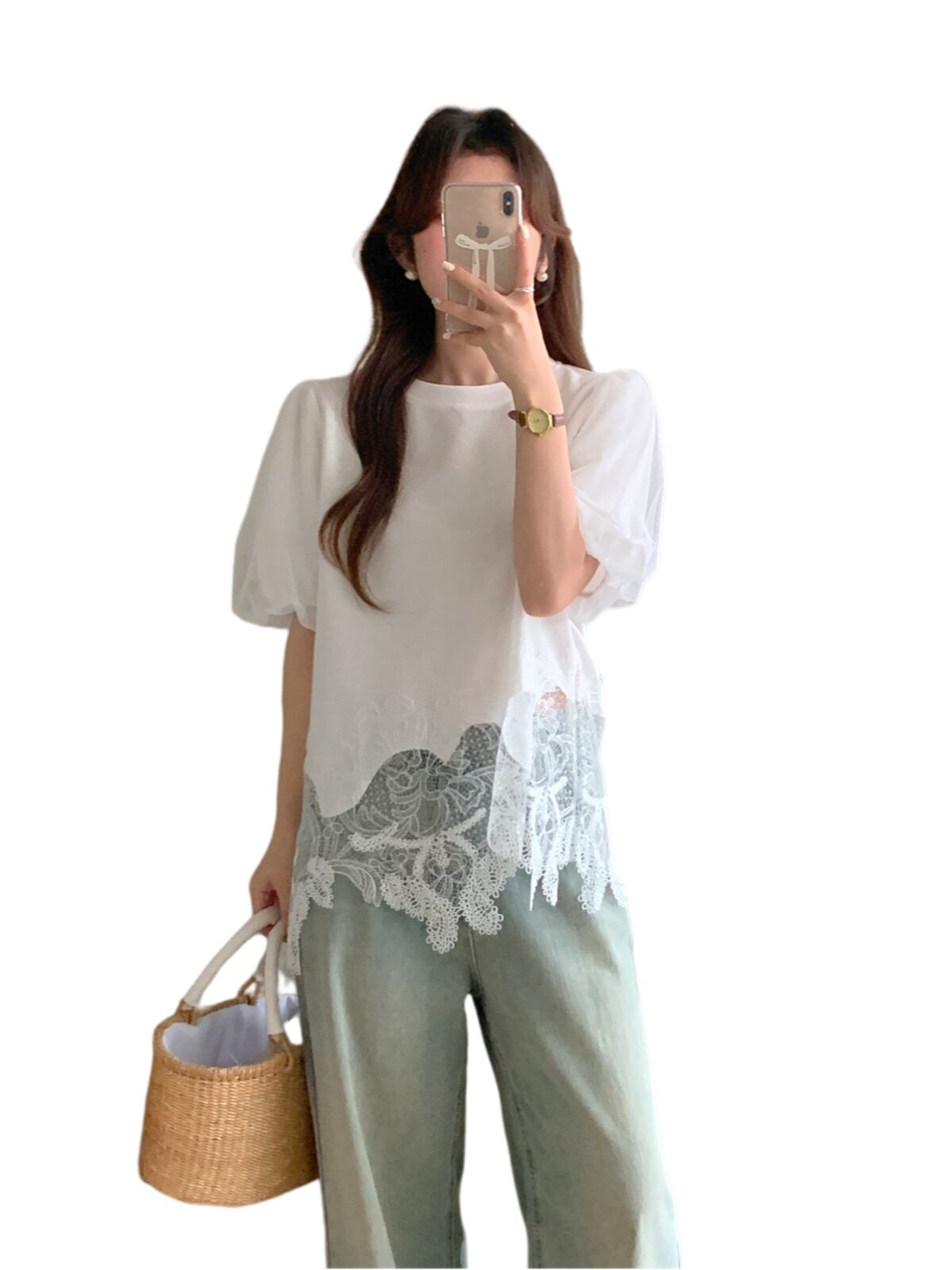 変形レースパフスリーブTシャツ