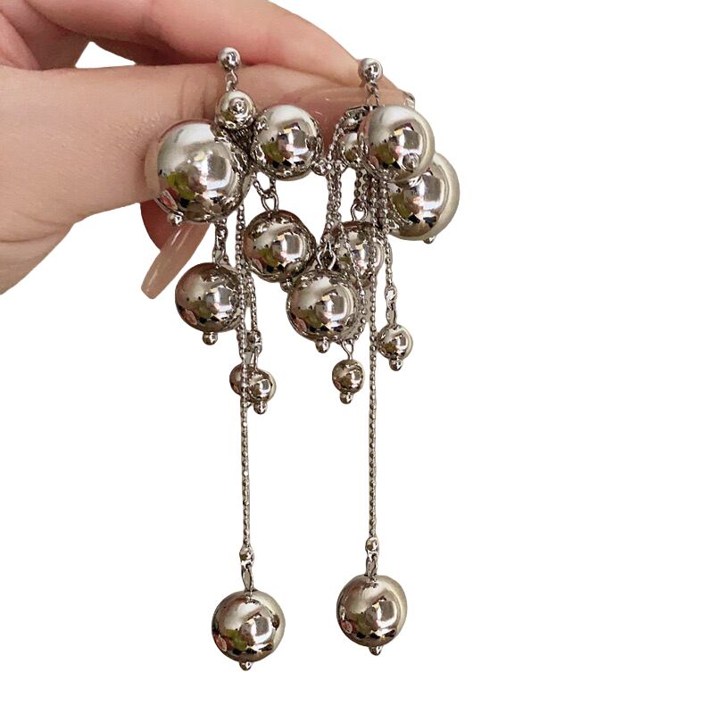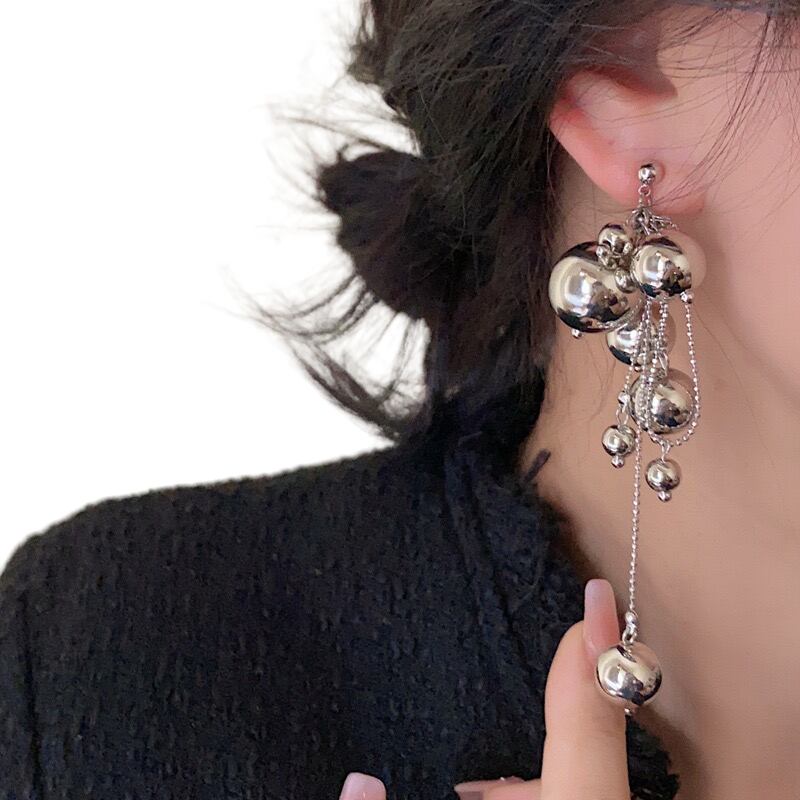 大小のメタルボールがチェーンで繋がった インパクトのある個性的なピアス♫ 動くたびに揺れるチェーンが 華やかなアクセントをプラスしてくれます♡ さりげないが高級感漂うデザインは どんなコーディネートにもマッチし お洒落度をグッと引き上げます♪